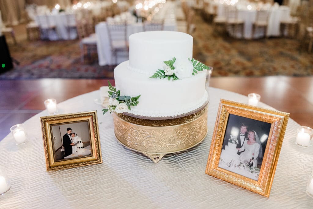 • Wedding photos of both sets of parents on the cake table (our new FAVORITE décor idea!)