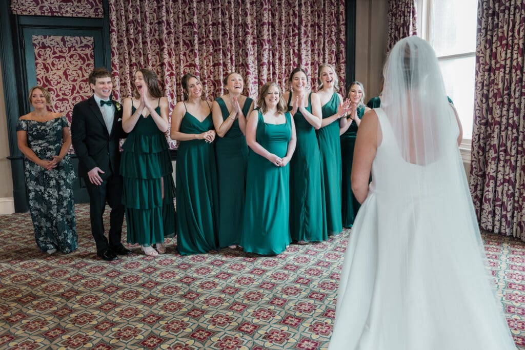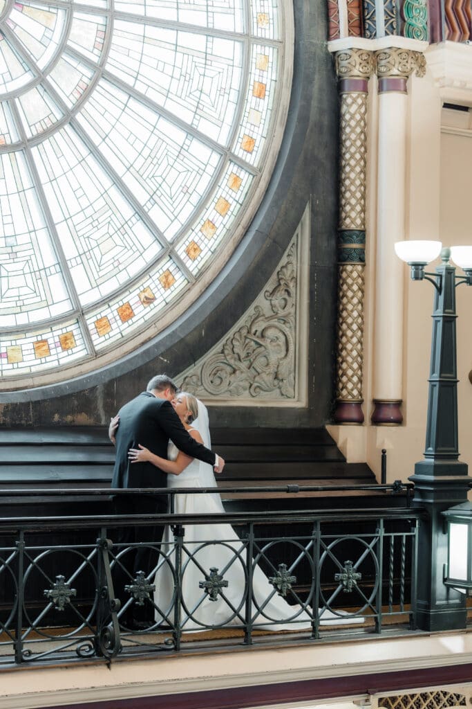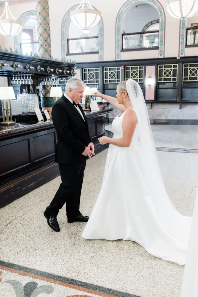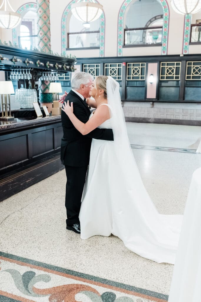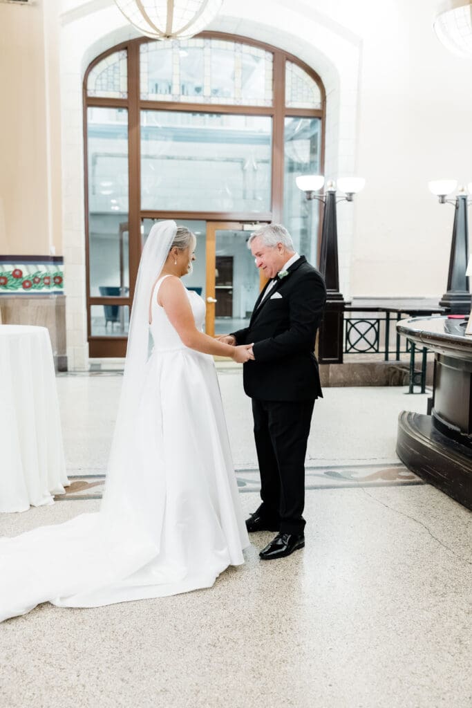 The first look train began with Madeline revealing her final look to her bridesmaids (and her brideman!)—such a fun, joy-filled moment. Then she shared the sweetest first look with her dad in the gorgeous Union Station bar area. Cue the tissues.