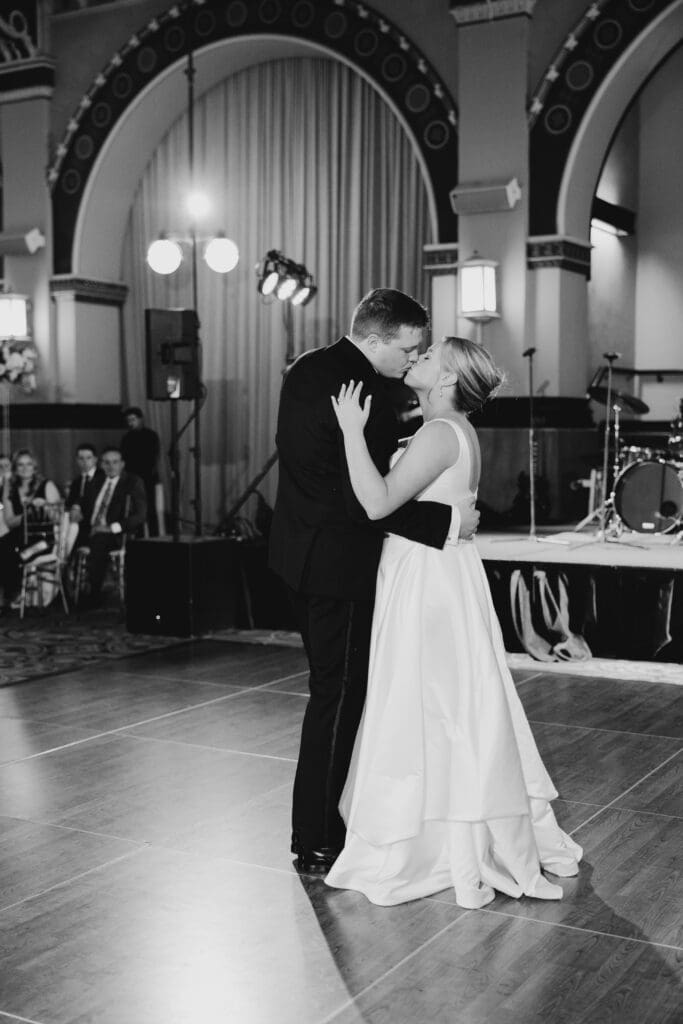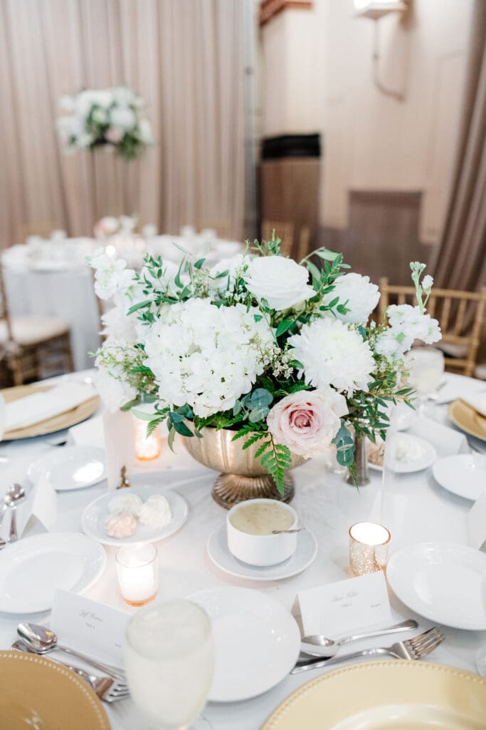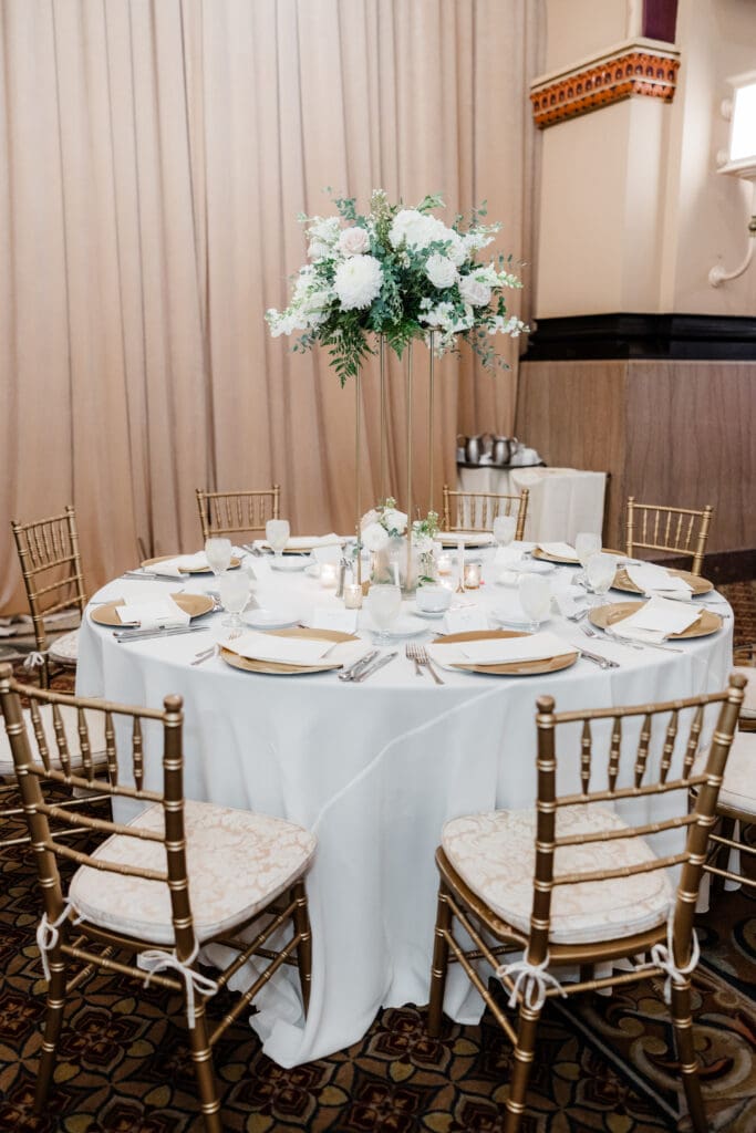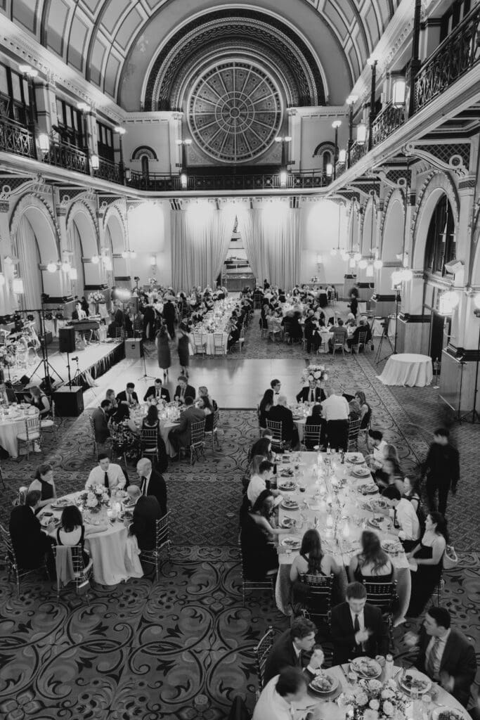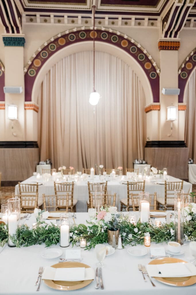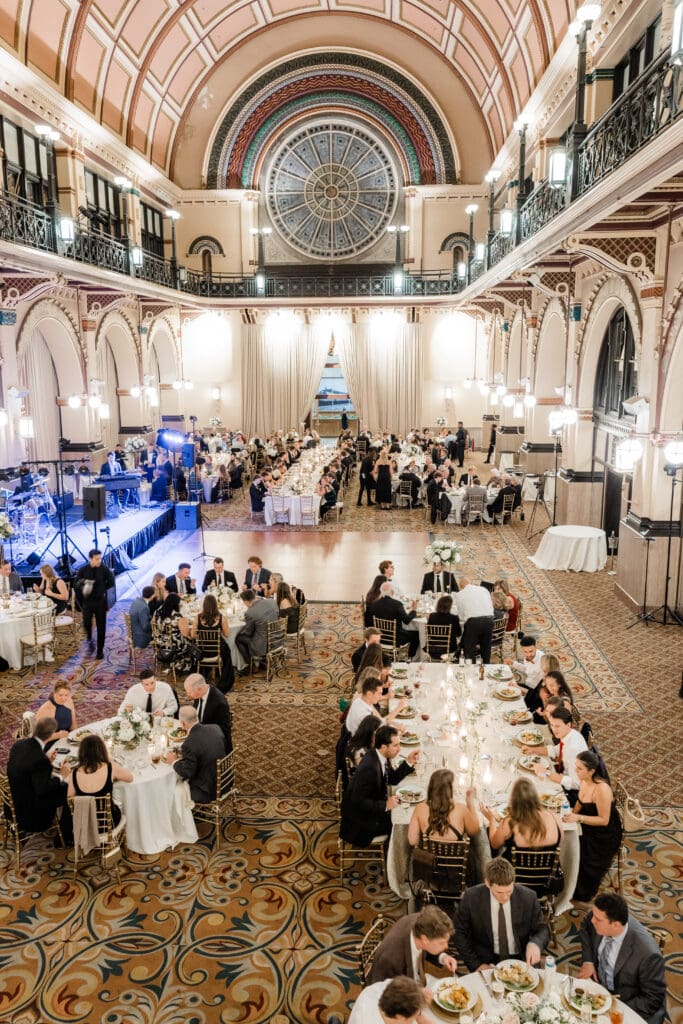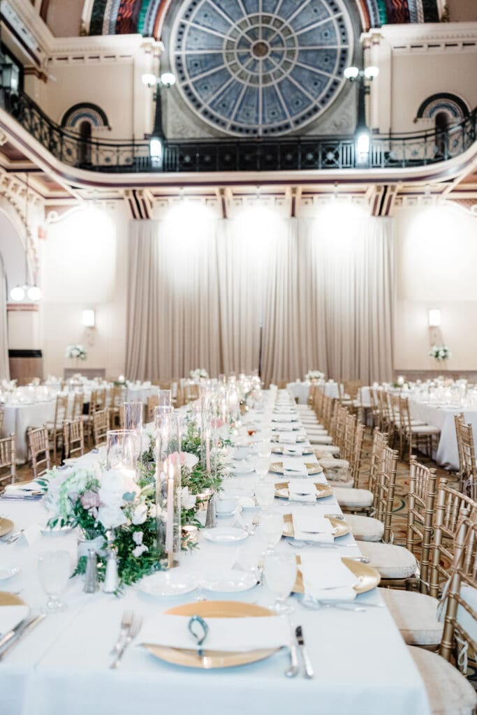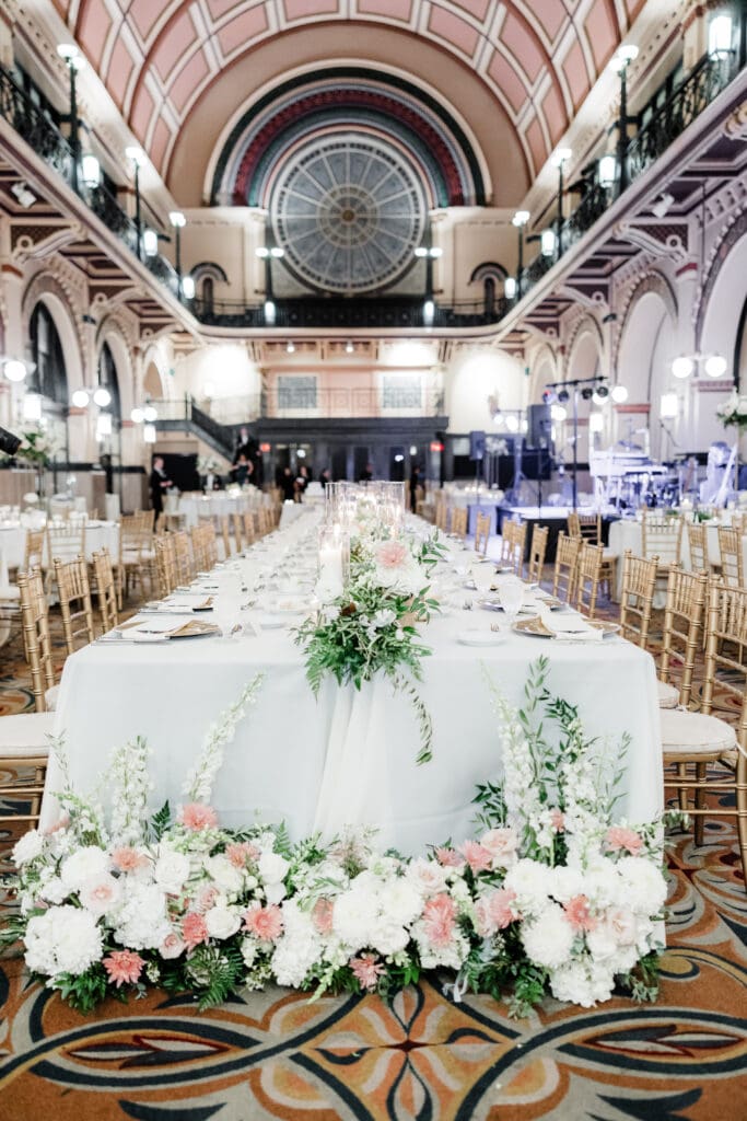 Back at the Union Station-Grand Hall, the reception space was set to perfection. Molly and Myrtle created incredible floral arrangements, and the layout mixed rounds and rectangles for a dynamic, inviting room.